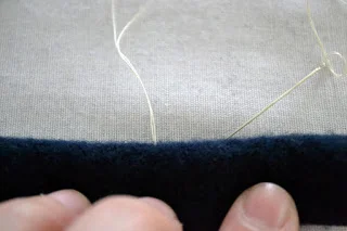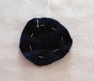 Cut a circle of fabric (finding the right size circle to start with can take some trial and error). Sew a row of running stitches around the circle. Placing your row of stitches closer to the edge is useful if your fabric is very thick: